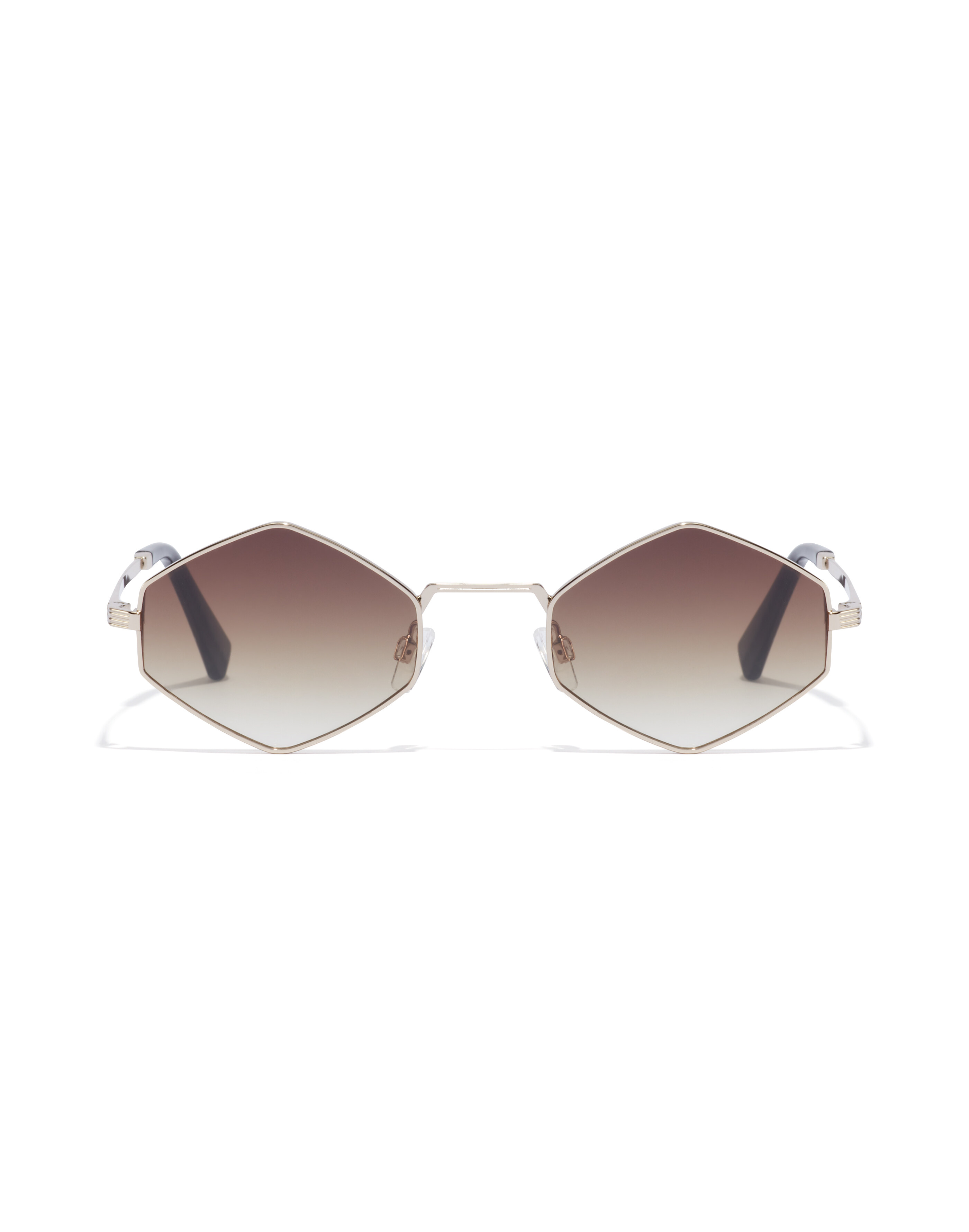 A return to the distinctive rave look of the early 90s with this slim hexagonal metallic sunglass design. Combining a polished gold stainless steel frame, black TR90 nylon earpieces and gradient smoky brown lenses.