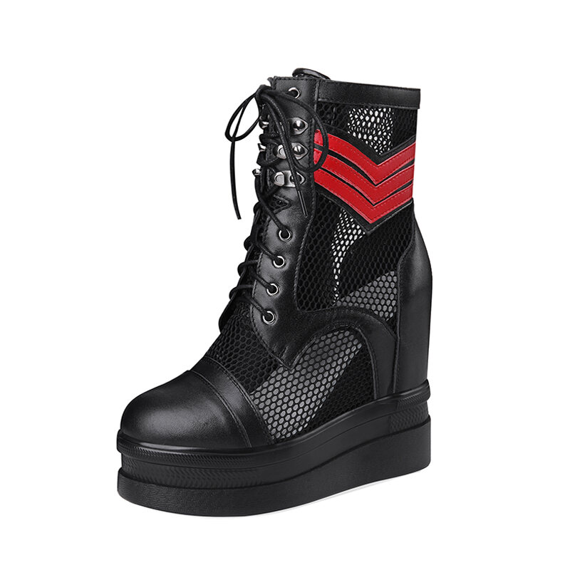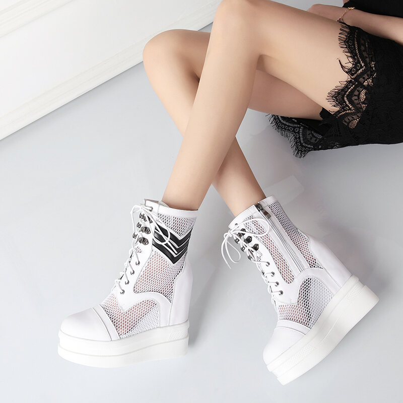 Genuine Leather Breathable Mesh Elevator 12cm Women's Shoes Sports High Heel Platform Muffin Shoes 2022 Spring and Summer Slimming