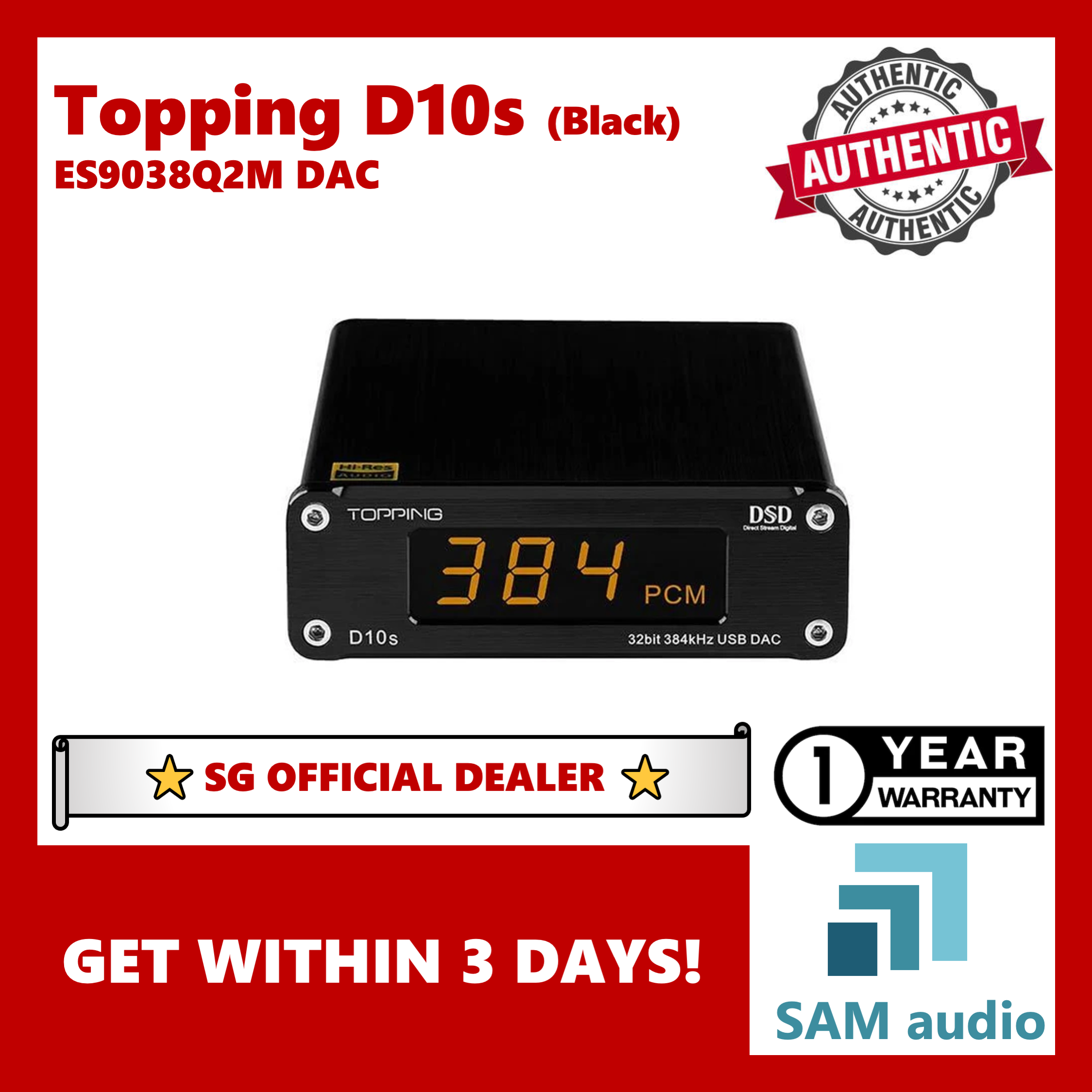 [SG] Topping D10s, ES9038Q2M DAC Hi-Res Audio, XMOS XU208 USB (o/p to Amplifier), Hifi Audio