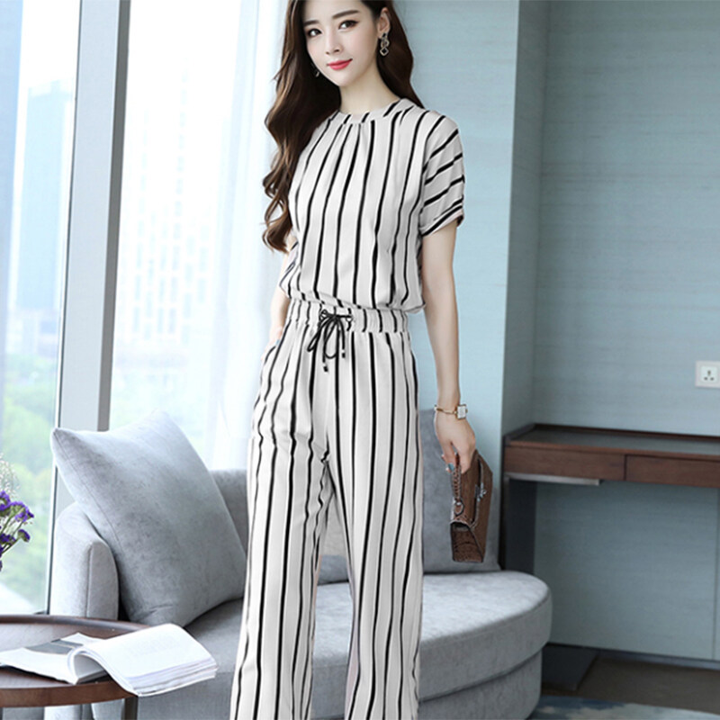 GUIN Womens Striped Leisure Suit Short Sleeved Blouse+Wide Leg Pants Two Pieces Set